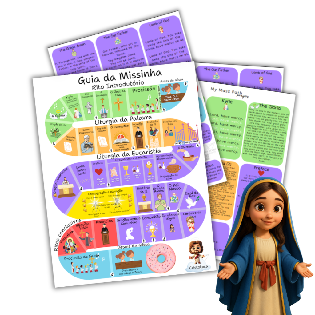Um arquivo digital em alta resolução, pronto para imprimir, contendo o Caminho da Missa totalmente ilustrado e adaptado para crianças acompanharem cada momento da celebração.